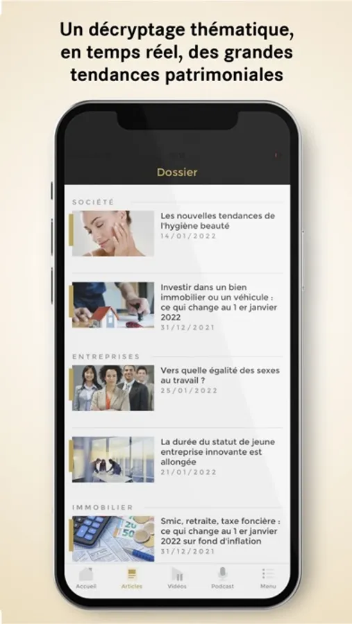 Nos 8 rubriques thématiques (Placements, Fiscalité, Société, Entreprises, Immobilier, Famille, Succession, Retraite) présentent les actualités de l’économie et des marchés financiers, afin de vous aider à prendre les bonnes décisions. Votre banque vous délivre ainsi de manière réactive des infos sur l’évolution de l’environnement de la gestion de patrimoine, de ses offres (produits et services), des événements à venir…