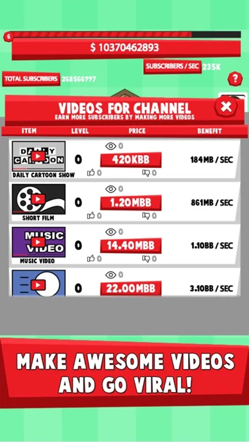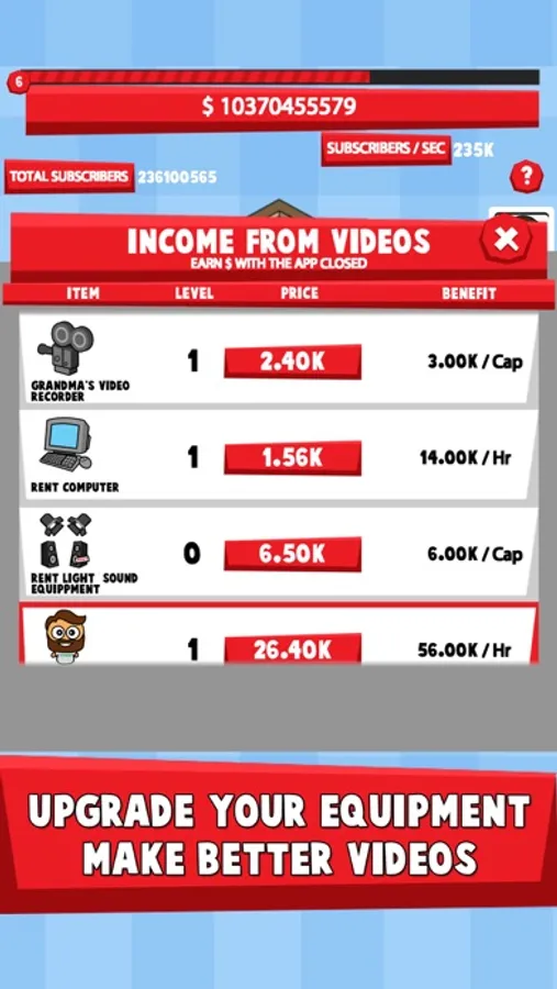 Tap to create as many videos as you can, which is the only best method for you to gain great popularity and money as well. Speed up the progress bar by increasing the numbers. Additionally, hiring some side jobs and making upgrades to your equipments are good helpers to accelerate your popularity.