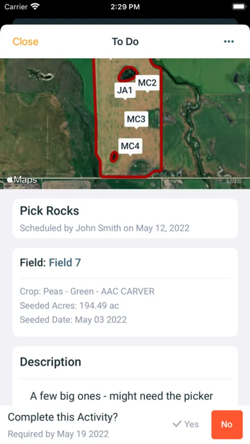 * Record spatial information using detailed field boundaries, view map layers, create pins for rocks and/or scouting observations.