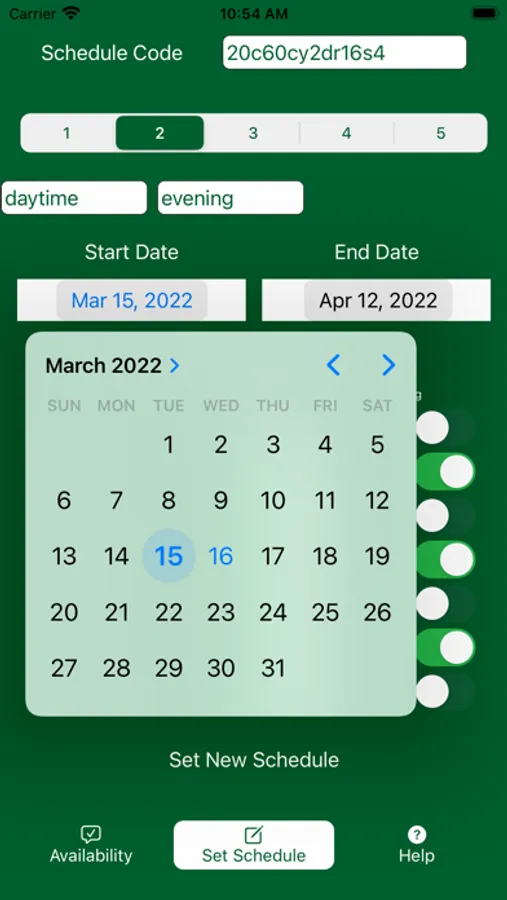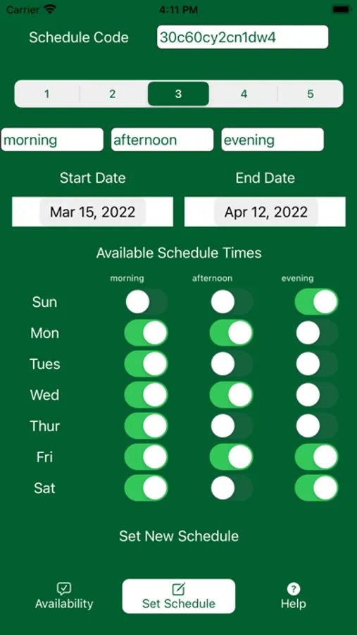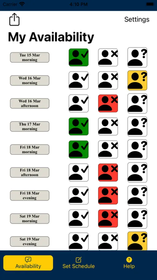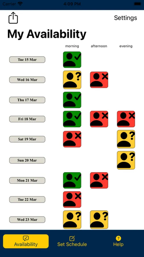 Designed for simple scheduling tasks it allows a scheduler to choose a range of dates and for each weekday 1 - 5 time periods with custom labels This may be distributed to members via a short code. Replies indicating availability for each period may be emailed to scheduler as a column of numbers 0 (not available) or 1 (available) or ? (uncertain) for pasting in a spreadsheet and in other forms..