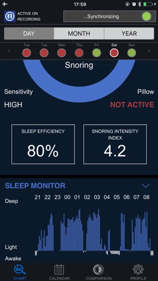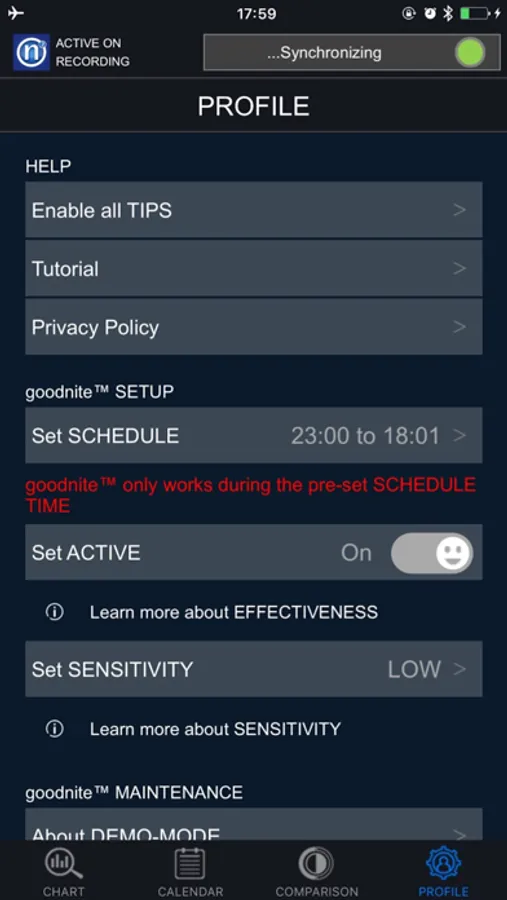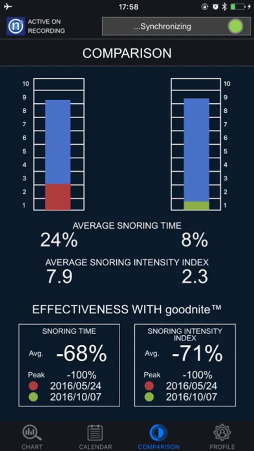 Nitelink2 application (APP) is designed to be used with the Interactive Anti-Snore Pillow goodnite™ from Nitetronic. Nitelink2 monitors and analyses the sleep time and quality, the snoring time and intensity. The user can determine the effectiveness of goodnite™ on his/her snoring.