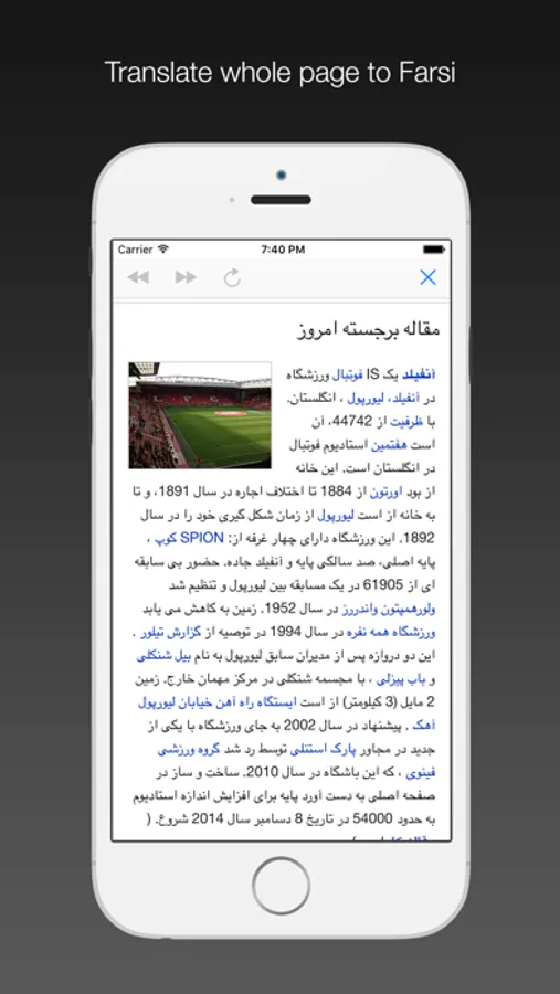The only one iOS app supports Farsi text-to-speech and translate a webpage in Safari to Farsi.