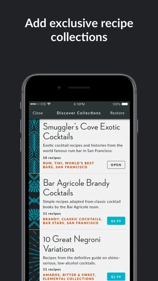 Elemental Cocktails is designed for people that want to make great drinks and collect great recipes. Explore essential craft cocktail recipes, complete with evidence-based histories. Add your own recipes and easily share them with friends or colleagues. Get inspired to make something new based on mood and/or spirit type. Experience cocktail recipes presented in a beautiful, unique format.
