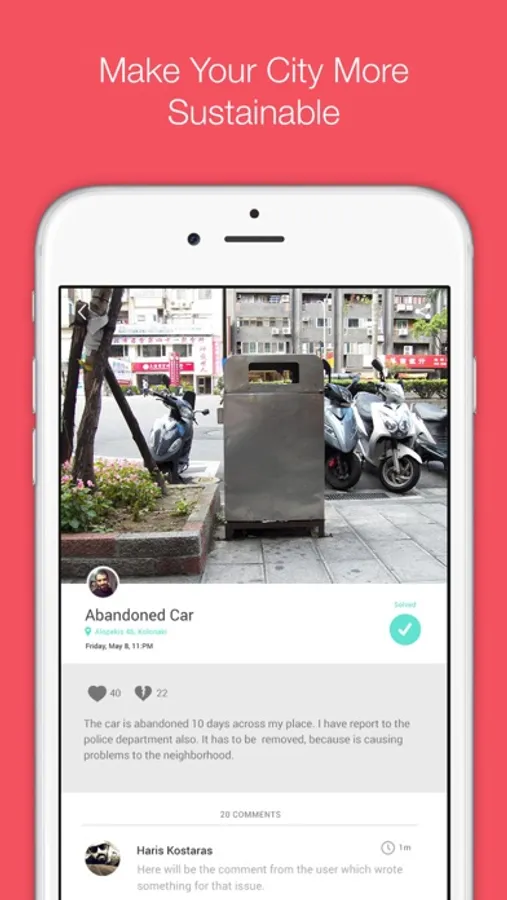 Τροφοδοτείς το σύστημα με σχόλια, κριτικές, φωτογραφίες, καταγράφοντας τα προβλήματα μέσα στη πόλη που ζείς. Περπατάς συναντώντας παρατημένα οχήματα, προβλήματα σε δρόμους και πλατείες, λάθος διατάξεις πεζοδρομίων, κακή διαμόρφωση χώρων για άτομα με ειδικές ανάγκες, ενοχλήσεις και προβλήματα που προσβάλλουν τον τρόπο ζωής σου;