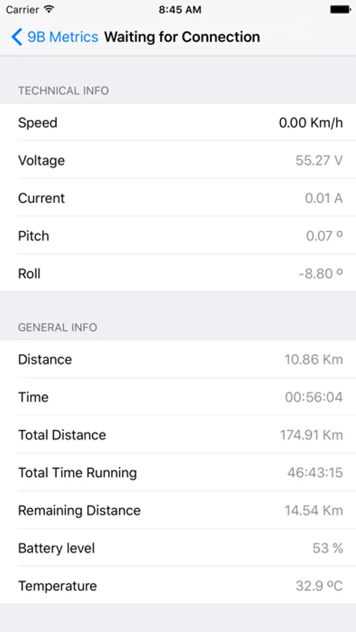 9BMetrics connects to your Ninebot One, Kingsong, Gotway or InMotion and logs wheel information: