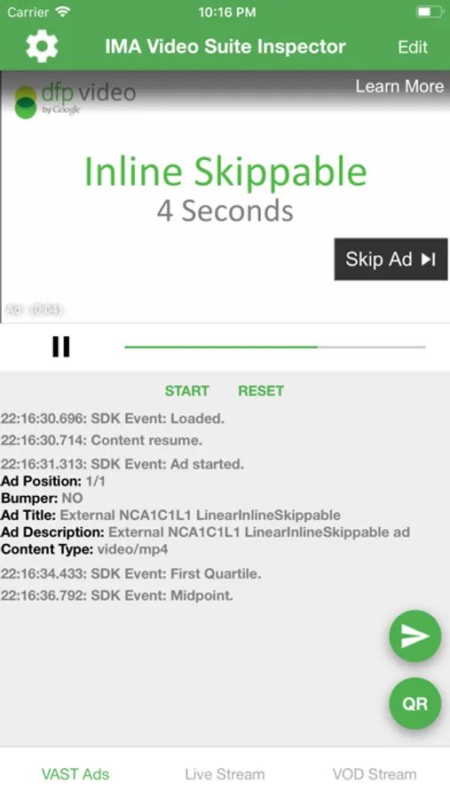 View and verify VAST video ad tags, Google DAI live streams, and Google DAI video on demand streams. Print, send, and share ad events for debugging and testing purposes.