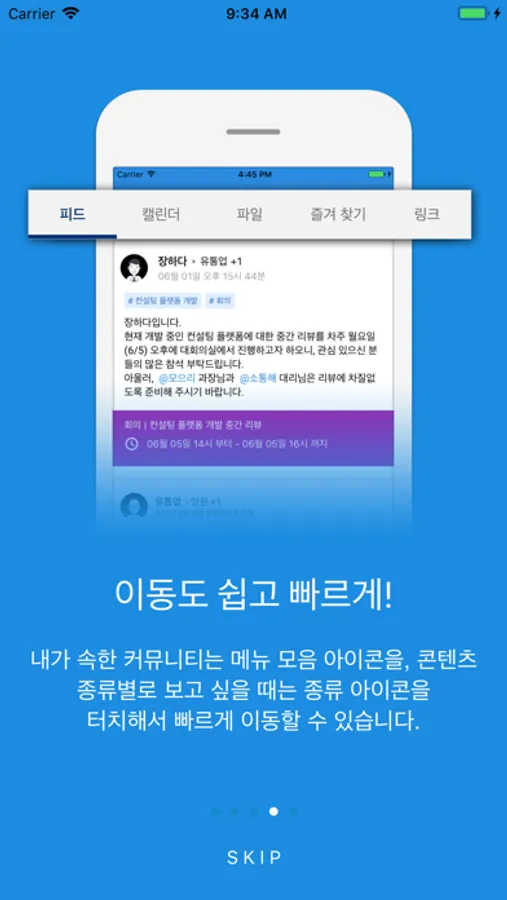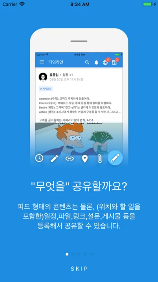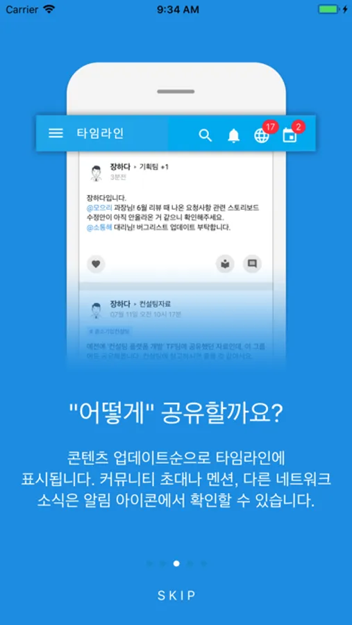 피드, 일정, 게시물, 파일, 링크, 설문, 위치 정보는 물론 메일이나 메모 내용 등 우리 팀에 필요한 모든 지식과 정보를 공유할 수 있습니다.