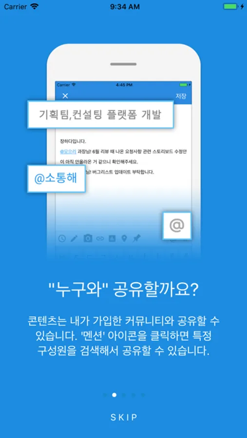 장기적으로 업무를 같이 해야 하는 동료들과는 ‘그룹’을 만들어서, 특정 구성원과 일시적인 정보 공유 시에는 ‘멘션’ 기능을 이용해보세요.