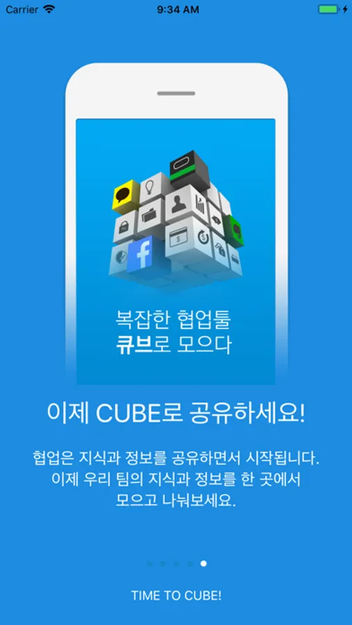 큐브(CUBE)는 업무 관련 지식과 정보를 다양한 형태(피드, 게시물, 일정, 링크, 할일, 위치, 파일 등)로 타임라인에서 모으고 나눌 수 있는 “팀공유 서비스(Team Sharing Service)”입니다.