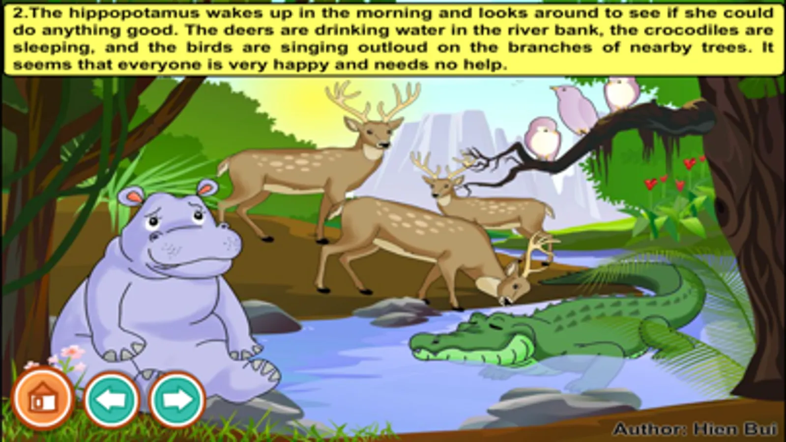 2. The hippopotamus wakes up in the morning and looks around to see if she could do anything good. The deers are drinking water in the river bank, the crocodiles are sleeping, and the birds are singing outloud on the branches of nearby trees. It seems that everyone is very happy and needs no help.