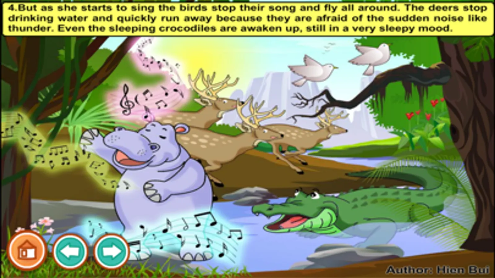 4. But as she starts to sing the birds stop their song and fly all around. The deers stop drinking water and quickly run away because they are afraid of the sudden noise like thunder. Even the sleeping crocodiles are awaken up, still in a very sleepy mood.