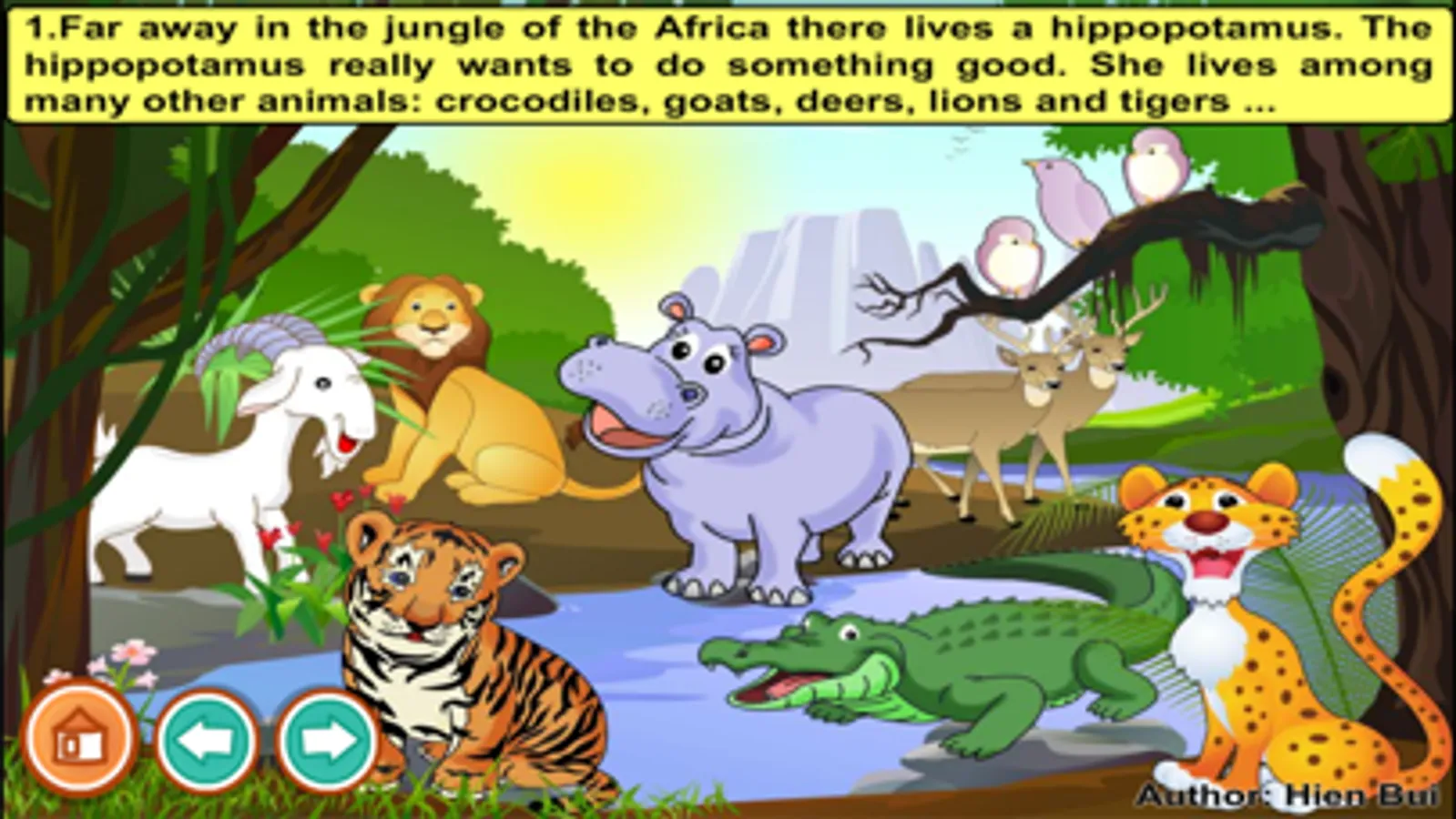 1. Far away in the jungle of the Africa there lives a hippopotamus. The hippopotamus really wants to do something good. She lives among many other animals: crocodiles, goats, deers, lions and tigers …