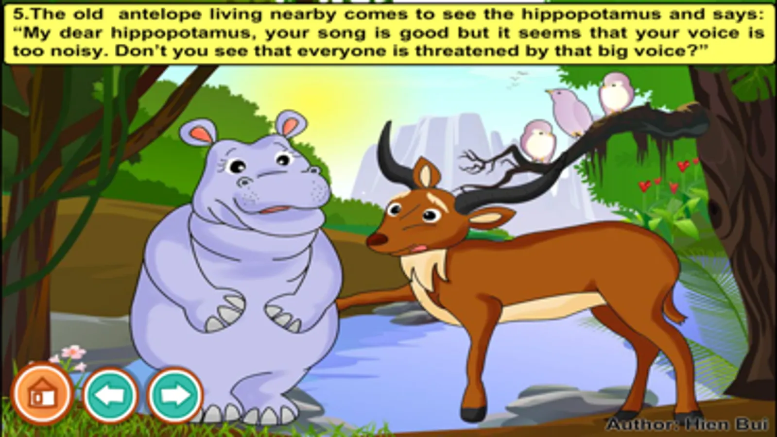 5. The old antelope living nearby comes to see the hippopotamus and says: “My dear hippopotamus, your song is good but it seems that your voice is too noisy. Don’t you see that everyone is threatened by that big voice?”