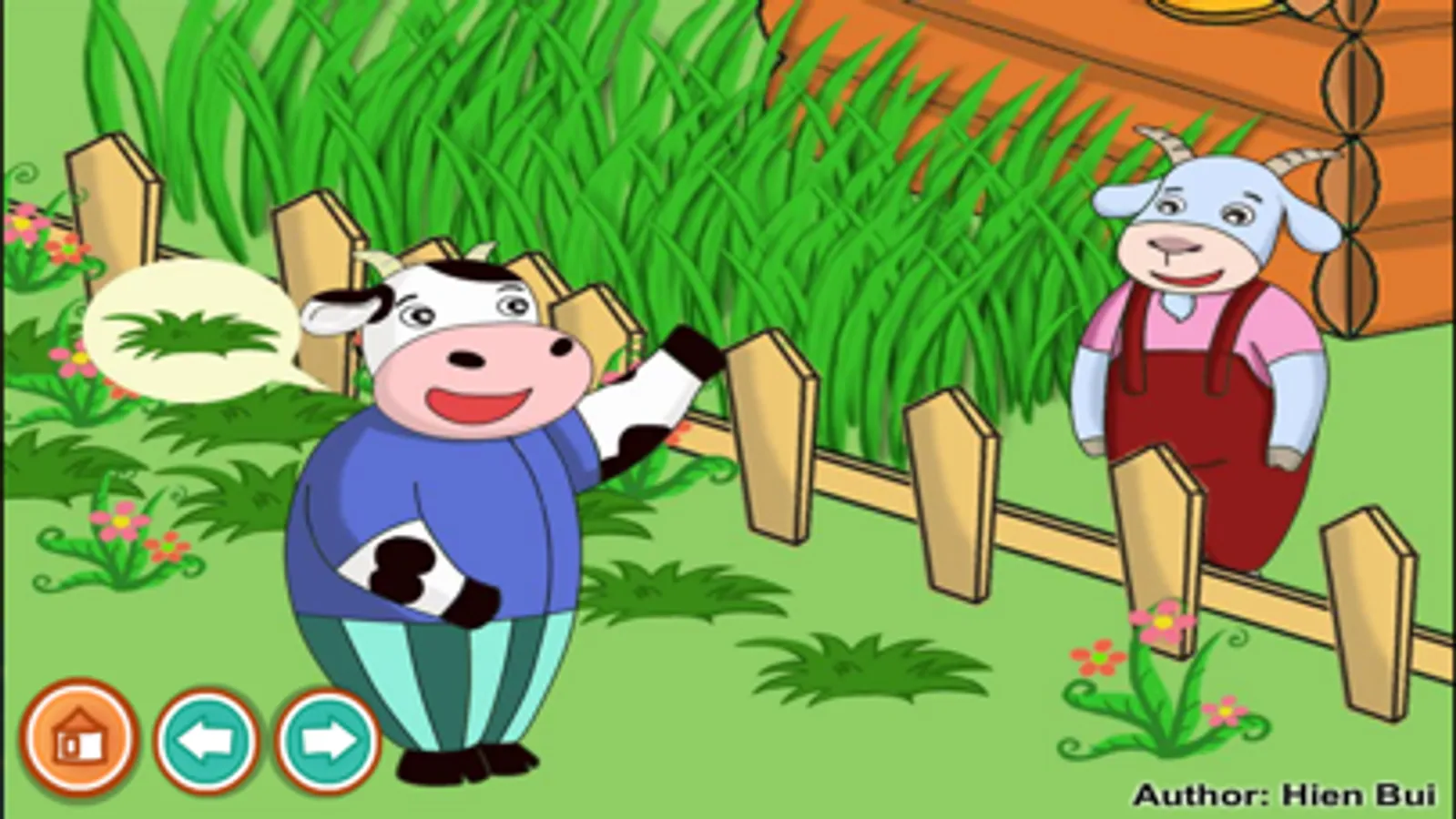 3. The cow is very nice to the goat also. He often invites the goat to his house to enjoy his special grasses that he plants :"My good goat friend, please come to my house to enjoy my grasses. They are so delicious and nutritious."