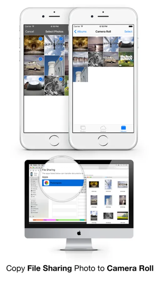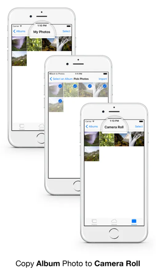 ◉ Copy photos or videos from Album to the iOS Camera Roll.