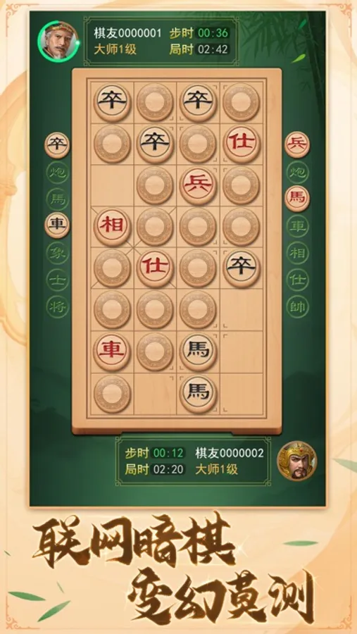 1、联网模式。联机匹配玩家对战,象棋暗棋随你挑,新手场、中级场、高级场任你选择,更有好友对战,创建房间,不在一起也能畅快对战!
