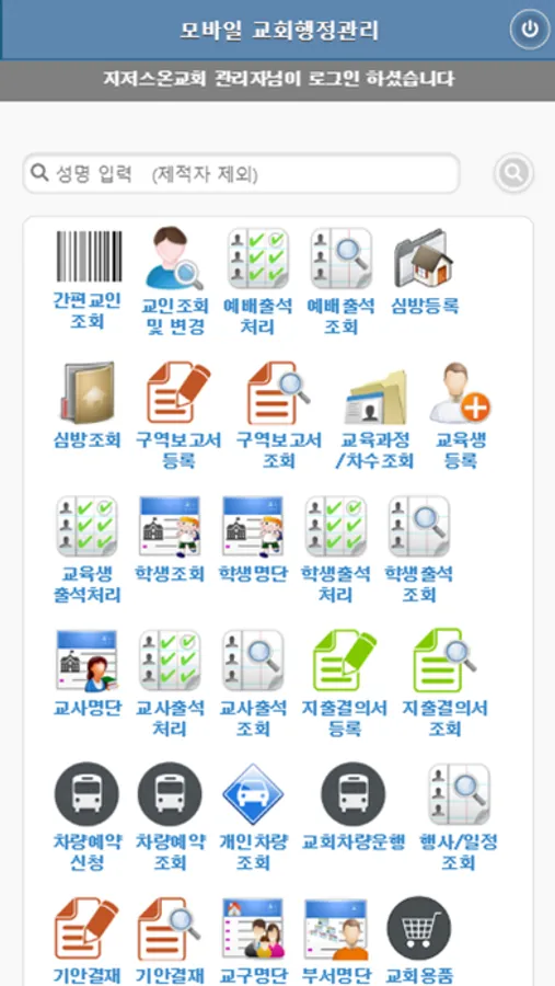 - 내 소속, 교인조회, 직분별, 교구, 부서, 교회학교 요람 열람