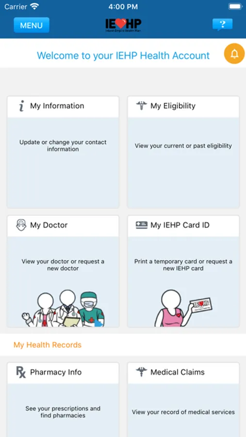 IEHP Smart Care App allows IEHP Members to manage their health account online, including changing their primary care doctor, checking their eligibility, updating their contact information, requesting a new Member Card, and checking their referral status, prescriptions, and claims and lab histories. You must be an active IEHP Member to log in to the app.