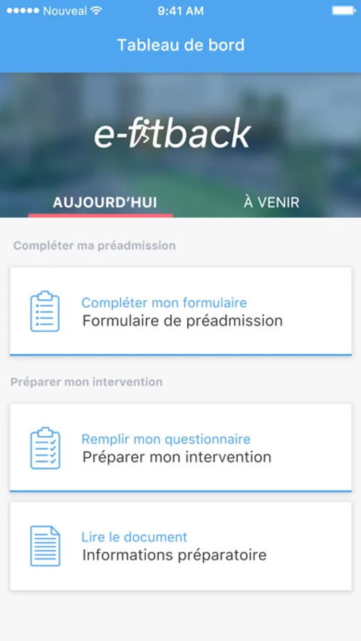 e-fitback est une application qui vous permet d’être connecté à votre établissement de santé et d’échanger de manière sécurisée des informations administratives et médicales tout au long de votre parcours de soins.
