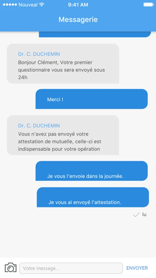 - Communiquez avec votre équipe soignante via la messagerie sécurisée, en envoyant des messages textuels et des photos.