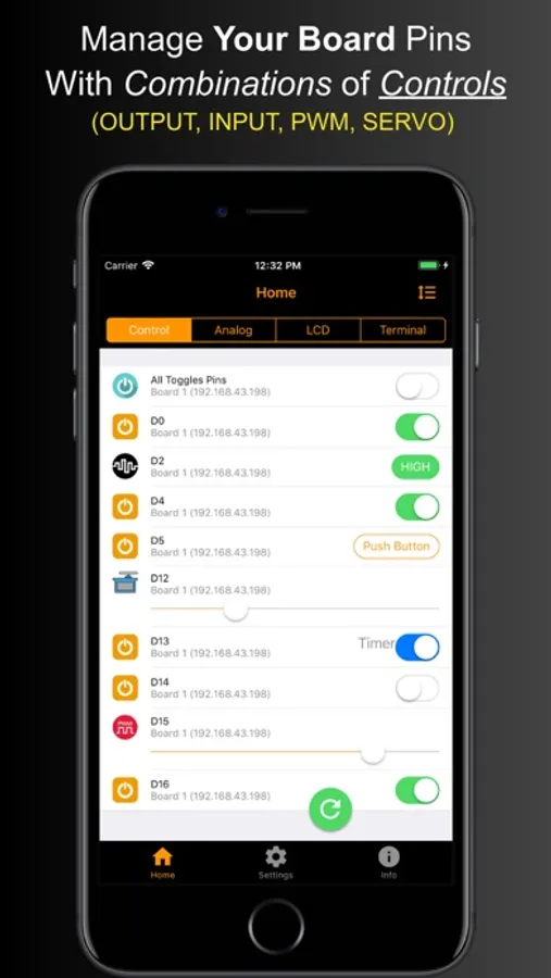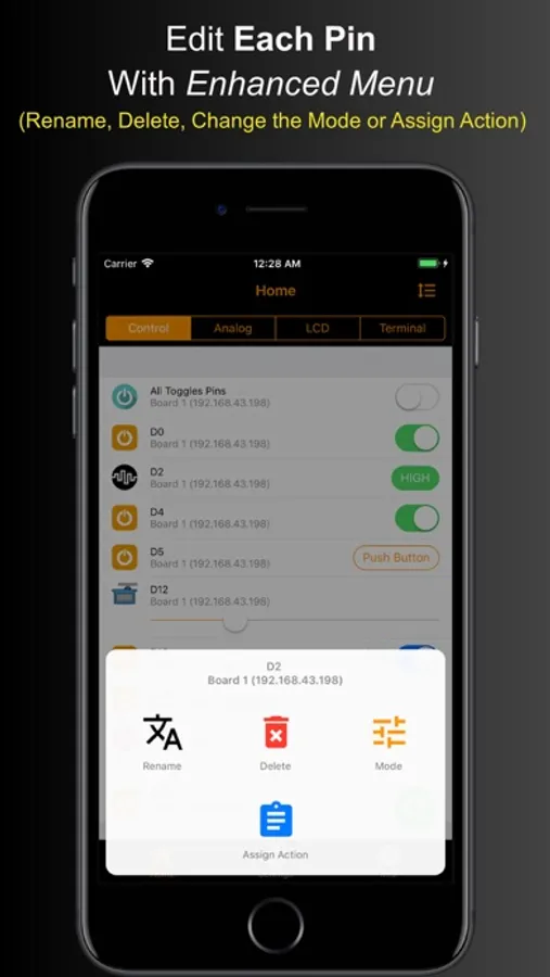 - Change the mode of the pin (Output, PWM, SERVO or Input).