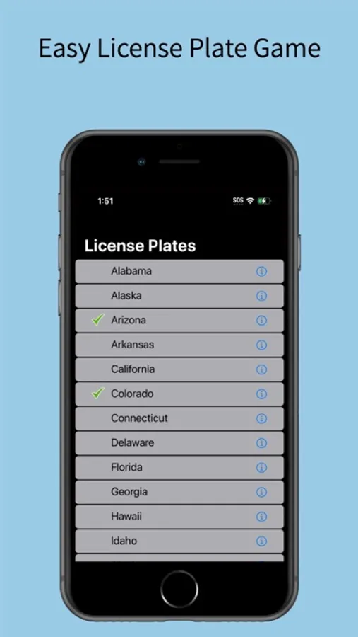 This is a simple license plate finder app. It is designed to be used by anyone with an iPhone and doesn't require wifi or a data plan to use it. Play the game while you travel, and see who can find all 50 state license plates first!