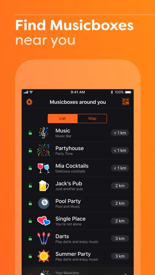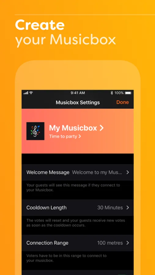 You can add your own music or easily add music from AppleMusic, Spotify, Audius or YouTube to your Musicbox. Then you just have to start your Musicbox and your guests can already vote for their favorite songs. If you allow it, your guests can even add songs to your Musicbox. The song with the most votes is the furthest up in the playlist of your Musicbox. To keep it exciting, the cooldown resets all votes after a fixed time and your guests can vote again.