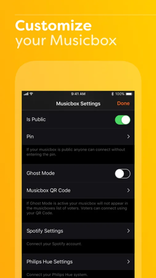 Connect to a Musicbox or create your own. Your Musicbox is ready to use within seconds. Just add a Playlist and press play. Just try it, it's really that simple.