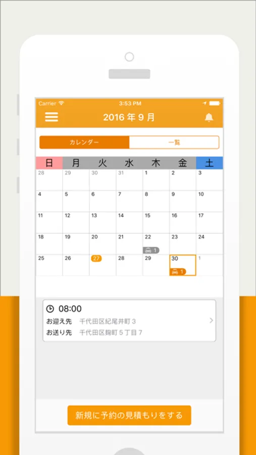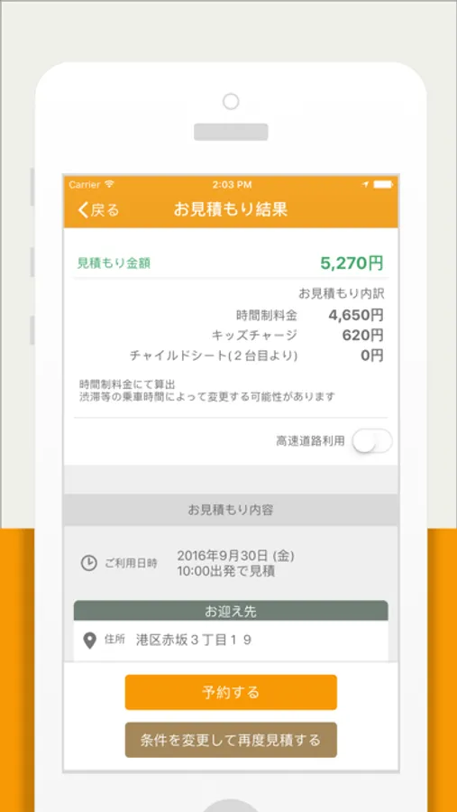 ご利用日時、お迎え場所、お送り場所をご指定頂くと事前にお見積もりを算出します。