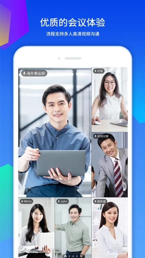 通过云会议你可以与其它人进行面对面的多人语音、视频沟通,并可相互共享白板、文档、照片或桌面屏幕,可在会议中用文字聊天。云会议广泛适用于企业开会、远程教育、在线培训、远程协助等场景。