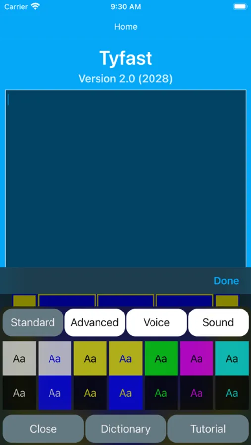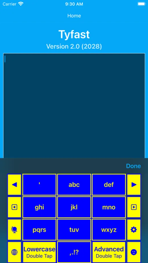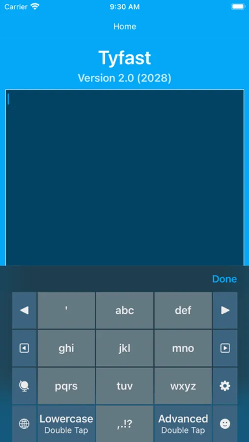 From version 2.0, the Tyfast keyboard has been totally restyled to provide a faster typing and comfortable use. All 9 keys are now visible on screen and can be used to type letters, numbers and symbols.
