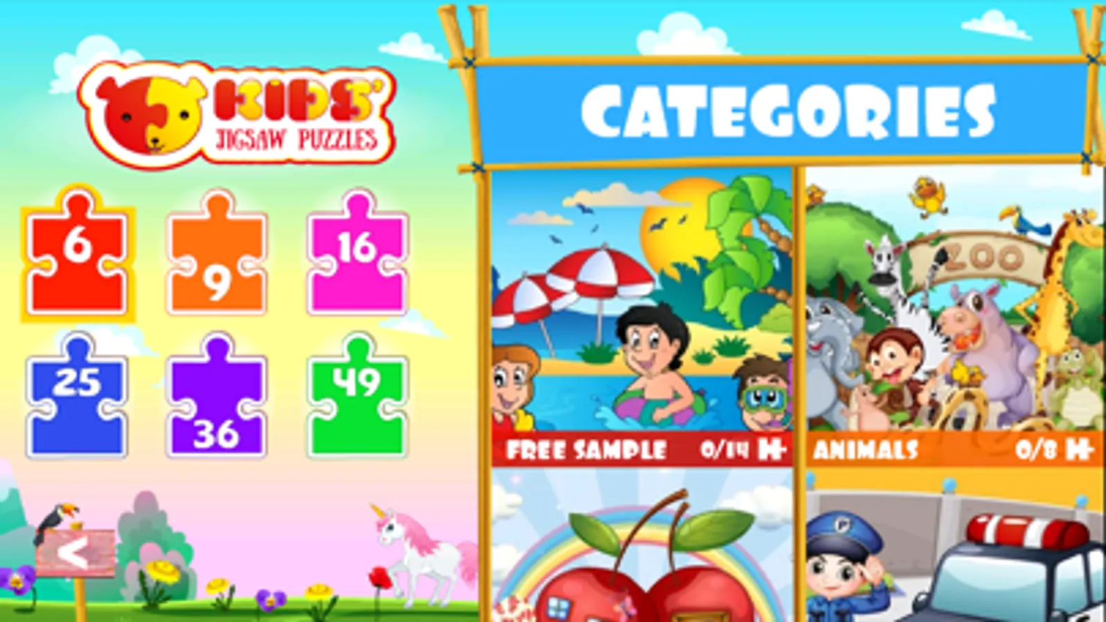 • Free version includes at least 14 beautiful pictures, you can unlock other using in-app purchases, buying any category will turn off all ads in the Kids’ Jigsaw Puzzles