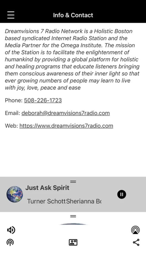 Dreamvisions 7 Radio Network is a Holistic Boston based syndicated Internet Radio Station and the media partner for the Omega Institute. The mission of the Station is to facilitate the enlightenment of humankind by providing a platform for holistic and healing programs that educate listeners bringing them conscious awareness of their inner light so that ever growing numbers of people may learn to live with joy, love, peace and ease.
