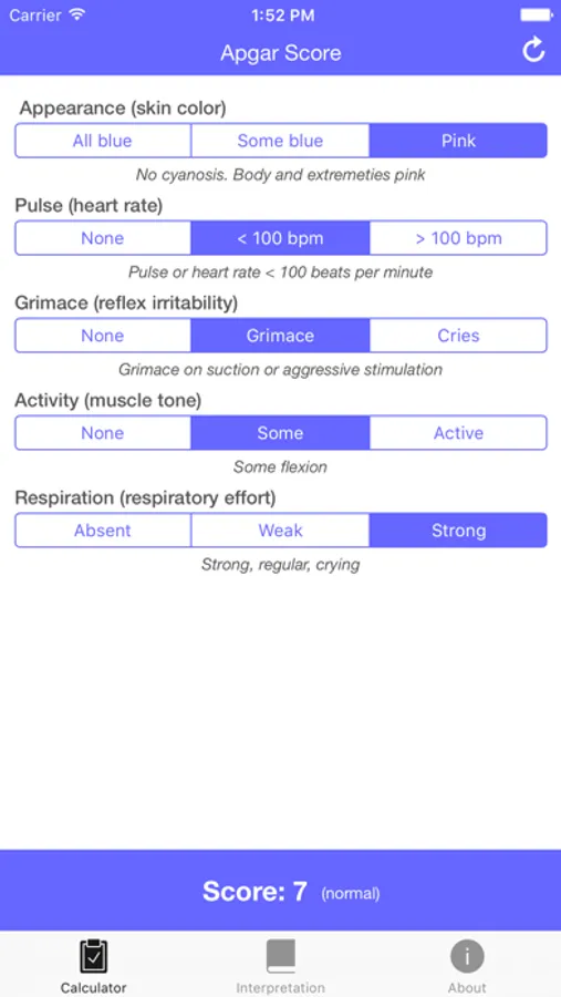 Apgar Score is a medical calculator designed for physicians, nurses, midwives, students and other medical professionals and is based on the system developed by Dr. Virginia Apgar to determine the health of newborn children. The Apgar score is determined by looking at five simple criteria: appearance (skin tone), pulse, reflex irritability, muscle tone and respiration. This app provides a convenient and easy way to quickly generate an Apgar score and determine if any medical intervention is necessary.