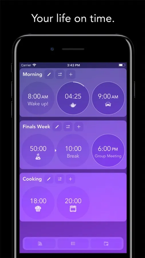 onTimer has a beautiful interface that is VERY easy to use. Just one tap to make a timer or alarm and customize it how you want. Stay organized by making multiple grids, each with a different purpose.