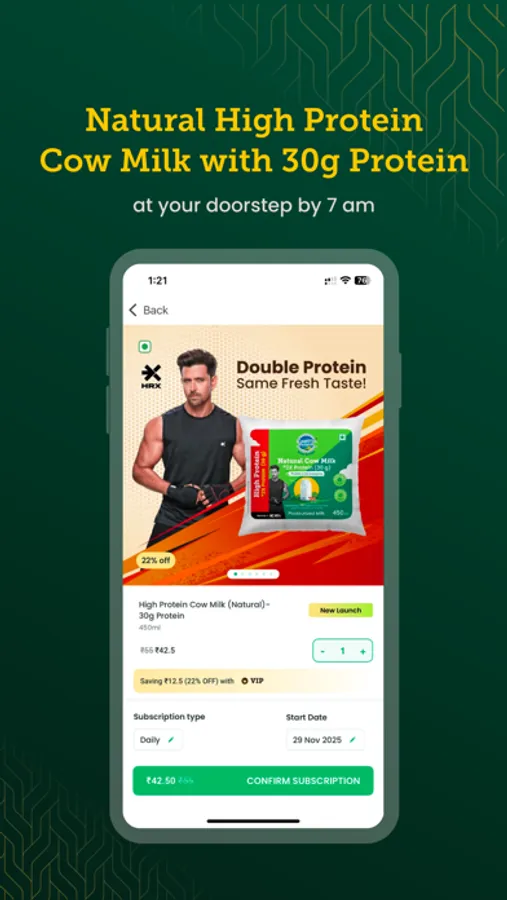 It is also easy to get our Milk or fruits and vegetables every day by creating a subscription plan for these essential groceries. Our customizable subscription plan makes life easier in more ways than one. It empowers you to get fresh milk every day while also giving you a transparent view of your monthly spends on groceries. This regular flow of farm-sourced essentials, combined with the flexibility to modify or add more products till midnight, will make consuming clean, healthy, tasty products every day very easy.