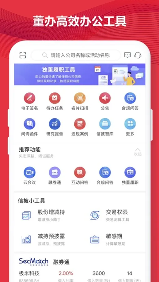 5. 集成了董办规范运作的专业合规管理软件,提供董秘办内部在信息披露、投资关系管理、三会运作等方面的管理功能,打造董监高交易合规、任务提醒、个性定制等服务一体化平台,实现董办事务的互联网+。产品覆盖:信息披露、法律法规、违规案例、问询函件、公告检索、财务分析、三会管理、股东分析、监管动态、资本运作、舆情监控、投资者关系等各项董办+业务。