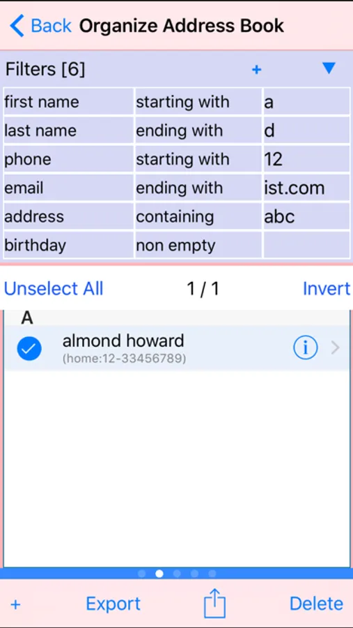 * to transfer individual contacts (sending via "Advanced Query”, receiving via "Import Address Book")