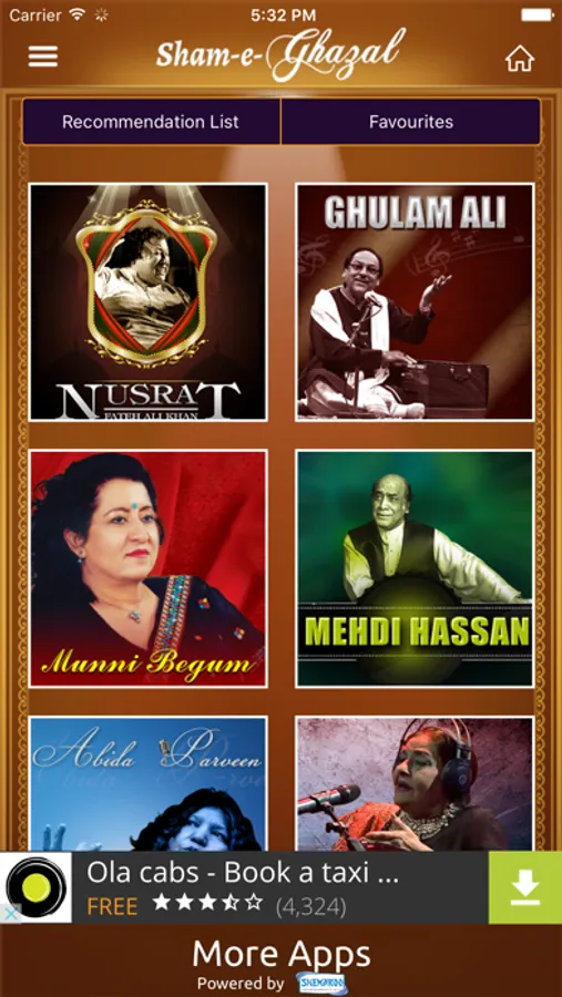 Shaam e Ghazal, welcome to the world of Ghazals were you can listen to famous Ghazal's sung by legendary and world most renowned artist like Abida Parveen, Farida Khanum, Ghulam Abbas Khan, Ghulam Ali, Hamid Ali Khan, Iqbal Bano, Mehdi Hassan, Munni Begum, Nayyara Noor, Nusrat Fateh Ali Khan