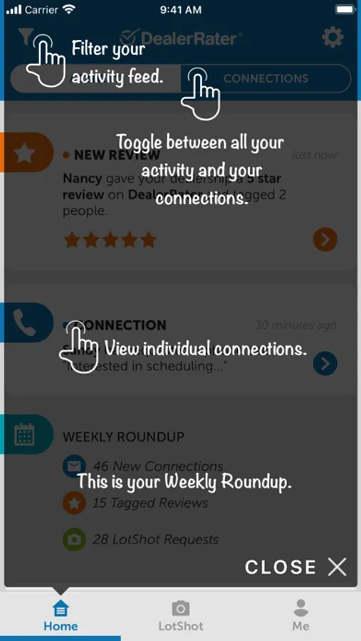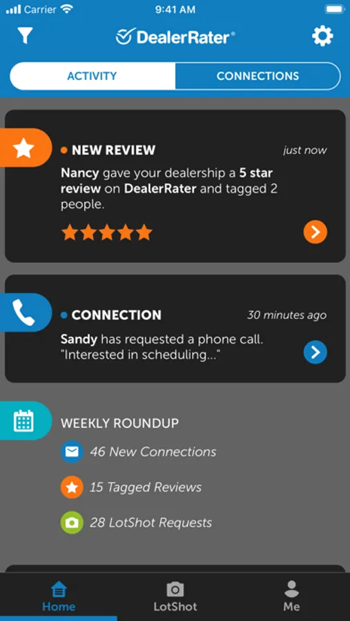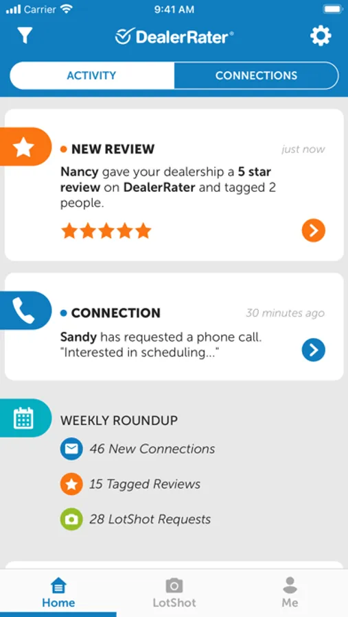 DealerRater’s mobile app, designed exclusively for use by employees of DealerRater Certified Dealers, will allow you to connect with your customers faster than ever. We’ve packed powerful features into a small package to help you easily connect and communicate with customers, snap and send LotShot photos, and manage and edit your DealerRater profile - all of which drives more sales and service business for you and your dealership.