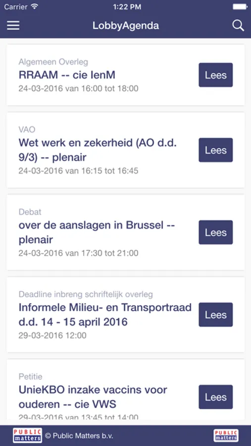 Deze app is ontwikkeld door lobby- en public affairs adviesbureau Public Matters. Cliënten van Public Matters maken gebruik van de app om dag-tot-dag op te hoogte te blijven van geduide informatie die belangrijk is om effectief de belangen te kunnen behartigen.