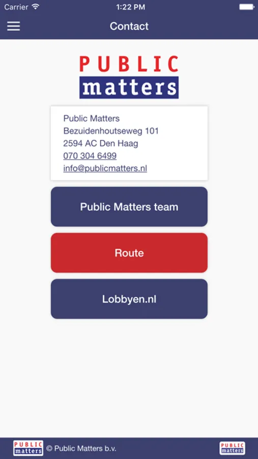 Beschikbare informatie verschilt per cliëntgebruikersprofiel. Dit kan bestaan uit ontwikkelingen in onder andere 'Den Haag', provincie, gemeente en/of 'Brussel'. De volgende versie van de Public Matters app bevat ook ContactMatters, de database met de namen, adres, en andere gegevens van stakeholders die voor een politieke en ambtelijke lobby van belang zijn.