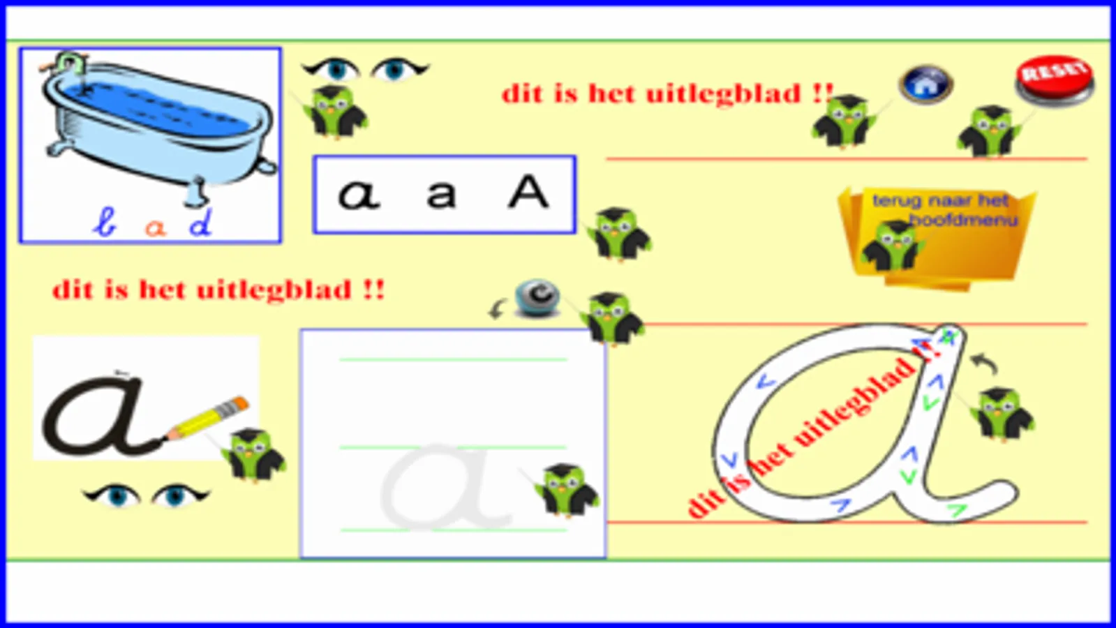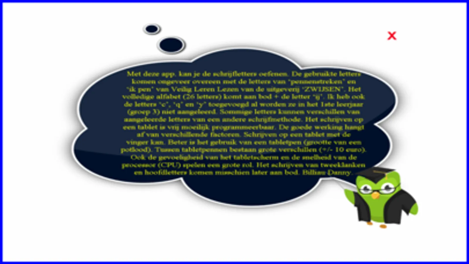 Met deze app. kan je de schrijfletters oefenen. De gebruikte letters komen ongeveer overeen met de letters van ‘pennenstreken’ en ‘ik pen’ van Veilig Leren Lezen van de uitgeverij ‘ZWIJSEN’. Het volledige alfabet (26 letters) komt aan bod + de letter ‘ij’. Ik heb ook de letters ‘c’, ‘q’ en ‘y’ toegevoegd al worden ze in het 1ste leerjaar (groep 3) niet aangeleerd. Sommige letters kunnen verschillen van aangeleerde letters van een andere schrijfmethode. Het schrijven op een tablet is vrij moeilijk programmeerbaar. De goede werking hangt af van verschillende factoren. Schrijven op een tablet met de vinger kan. Beter is het gebruik van een tabletpen (grootte van een potlood). Tussen tabletpennen bestaan grote verschillen (+/- 10 euro). Ook de gevoeligheid van het tabletscherm en de snelheid van de processor (CPU) spelen een grote rol. Het schrijven van tweeklanken en hoofdletters komen misschien later aan bod. Ik heb deze oefeningen gemaakt steunend op mijn 25 jaar ervaring als leerkracht 1ste leerjaar. De meeste oefeningen worden zowel visueel als auditief ondersteund. Billiau Danny.