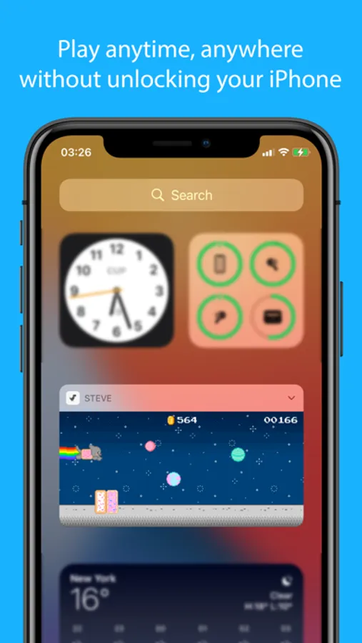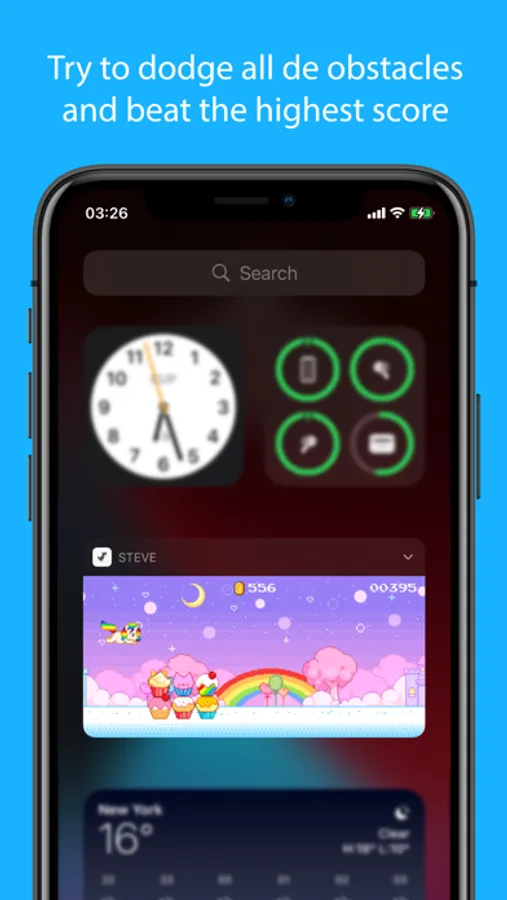 Play with ‘Steve’ anytime, anywhere, by just dragging down from the top on your screen to reveal the notification center and your new dino-friend will be there waiting for you! Thanks to an intuitive and easy touch control anyone will enjoy with our unique characters in this AMAZING WIDGET! Jump and jump with only ONE FINGER! Our challenging environments have been designed like the old school arcade games, do you accept the CHALLENGE?