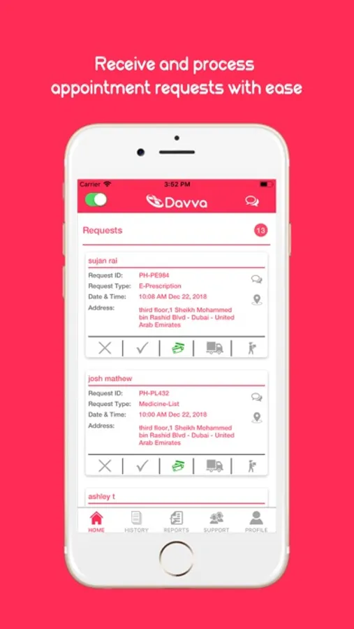 Davva Partner is an app for healthcare partners providing services through the Davva app. The partners can manage and process daily requests through the app along with get an analysis and overview of their activities. Currently Davva services are only available in the United Arab Emirates and we are working hard to increase our presence in the region and beyond.