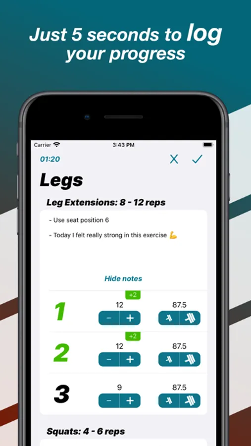 With Progression, you can log your workout performance with just one tap – saving you time and minimizing distractions. Plus, the app automatically increases the weight and decreases the repetition count for each exercise set after you've reached your maximum repetitions, helping you push yourself and make steady progress over time.