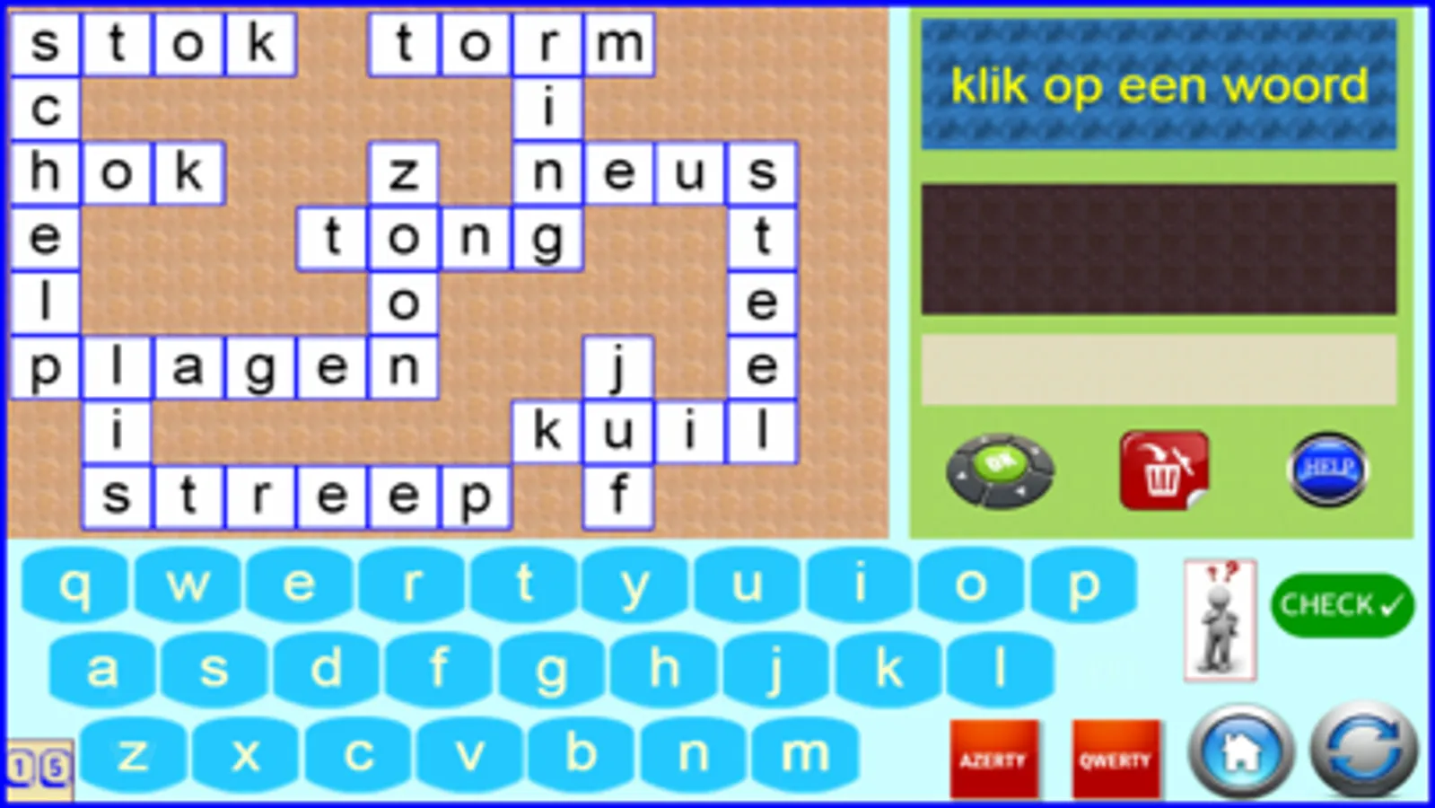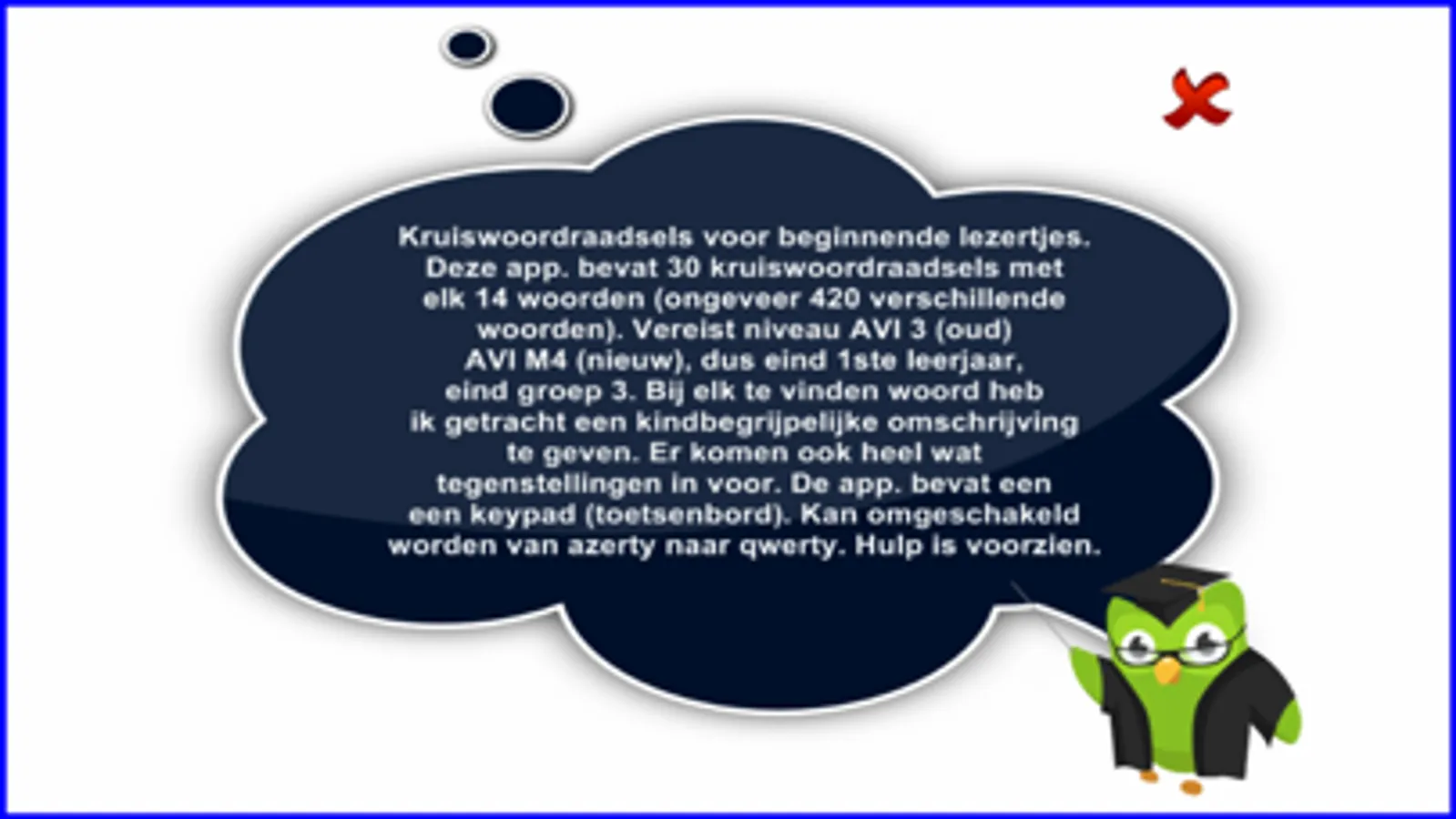 Kruiswoordraadsels voor beginnende lezers. Minstens AVI-niveau 3 (oud) AVI-M4 (nieuw). Deze app bevat 30 kruiswoordraadsels met elk 14 woorden. Elk te vinden woorden wordt zo kindvriendelijk mogelijk omschreven. Hulp is voorzien.