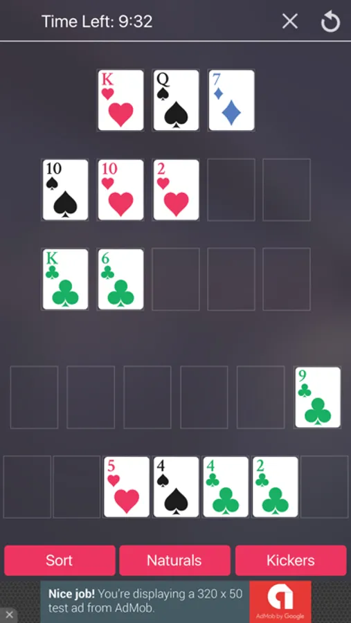 You are dealt 13 cards and must make three poker hands. The best hand on the bottom, second best in the middle and last three cards on top.