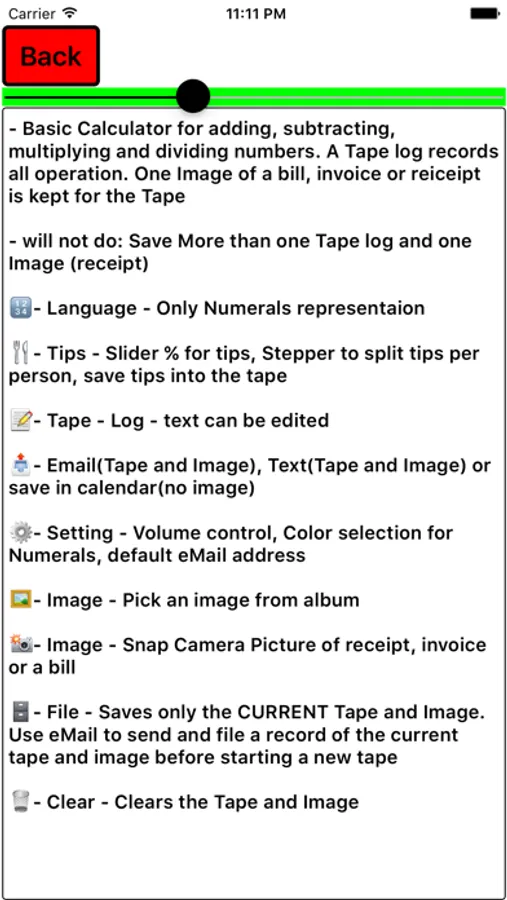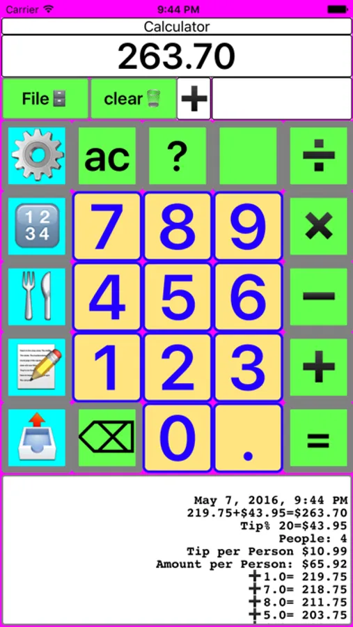 This is a simple tape (log) calculator with select colors, few numerical languages and a tip/split calculator. All meaningful actions are saved and recorded in the tape (log). The user can change digits colors, font size, operand colors and their shape. The tape content can be sent as text with an image to others email or sms recipients . The user can attach the image if a camera or a the