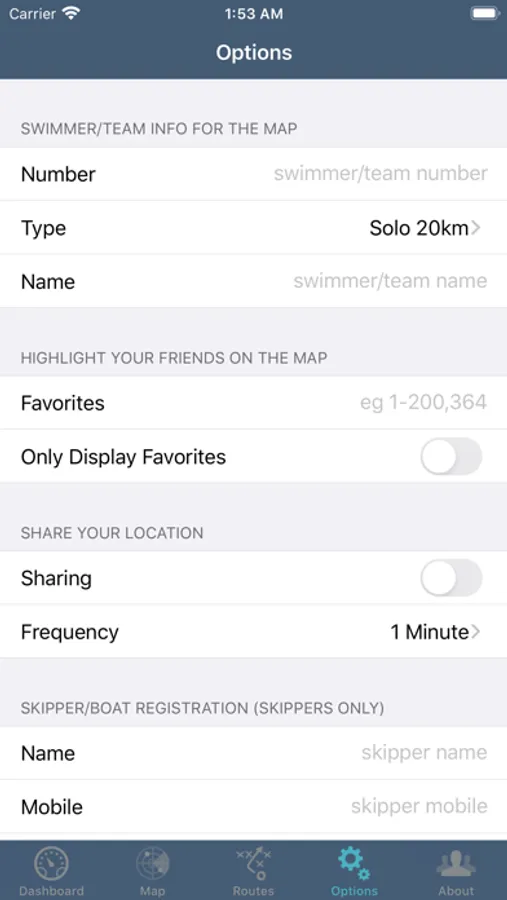 The location captured by Port to Pub can be shared with other users of the app, and with viewers of the mapswim.com web page, via switching on sharing.